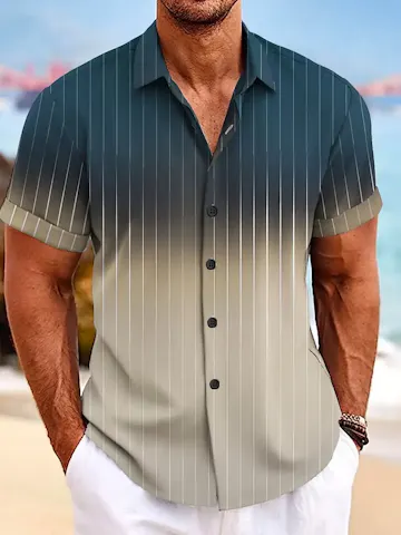 Gradient Stripe Shirt, Gradient Stripe Print Men's Casual Shirt with Turn- Collar Short Sleeve.